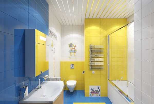 Ванная. Синий цвет для отделки ванной комнаты считается классикой жанра. Ванная в желто-синем цвете кажется просторнее. Это может быть комната в морском, средиземноморском стиле. Акцентом послужат желтые шторы, васильковый цвет плитки.