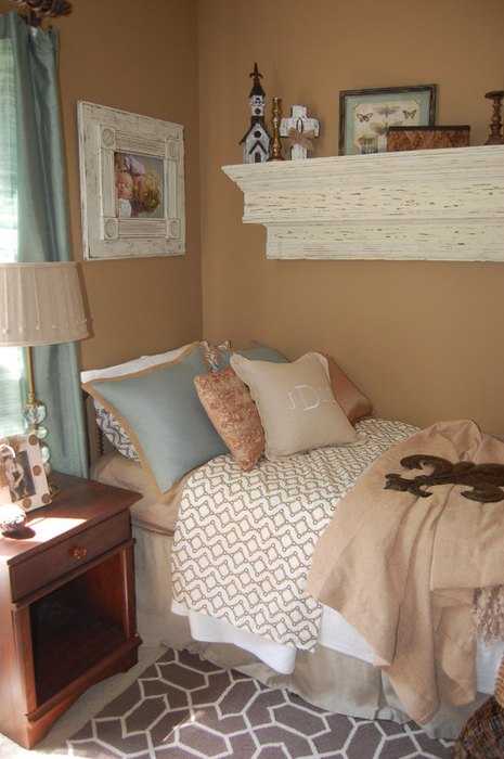 В спальне сочетания коричневого и синего можно использовать в постельном белье, на шторах, в обивке мебели. Это отличный вариант для сезонного обновления интерьера. но здесь нужно помнить, что яркие бирюзовые оттенки способны бодрить. Их стоит использовать в меньшем количестве, заглушая их буйство благородным коричневым цветом.