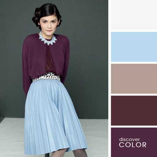 Такое сочетание можно применять несмотря на то, что оба цвета относятся к разным цветотипам. Сливовый- это теплая гамма, а голубой — холодная. Но природа у них общая. Голубой будет немного охлаждать горячий темперамент сливового, и в итоге мы получим необычное, но очень эффектное сочетание. При этом хорошо, если для закрепления эффекта один из цветов будет повторяться в двух раздельных деталях образа, как мы это видим на фотографии. Голубой представлен на юбке и ожерелье, это объединяет весь образ в единое целое.