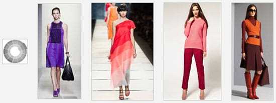 В коллекциях лучших мировых брендов, если используется разноцветная ткань, то её оттенки всегда строго сбалансированы (если конечно это не дерзкие опыты эпатажных модельеров с целью ошеломить публику). Все цвета сгруппированы из наборов схожих оттенков, группы оттенков назначаются по одной из схем. Самые сочные и яркие полихроматические сочетания получаются если взять тона, расположенные на круге по углам квадрата или прямоугольника. Это две комплементарные пары — Тетрада и квадрат.