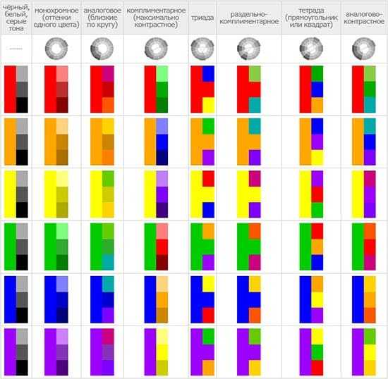 В таблице представлены 6 из 12 основных цветов, с которыми составлены 8 самых используемых стилистами комбинаций (то есть 6 х 8 = 48 контрастных сочетаний без оттенков). Чтобы иметь возможность в любой момент получить все комбинации всех 12 тонов с оттенками, рекомендуем приобрести цветовой круг дизайнера и художника. Подробное описание его устройства, а так же инструкция по использованию — на главной странице сайта.