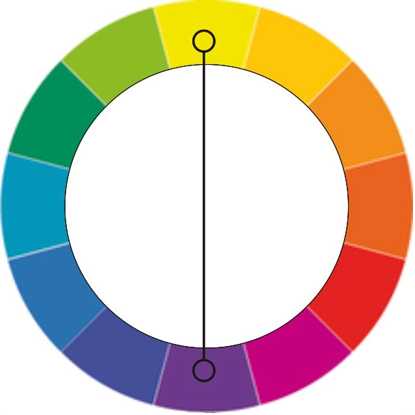 Принцип означает, что прекрасно гармонируют между собой и отлично сочетаются цвета, стоящие на противоположных краях спектрального круга. Внимание: при использовании этого принципа следует понимать, что в этом случае обязательно один цвет будет теплым, другой холодным. Это довольно смелый принцип, но, тем не менее, он всегда прекрасно работает.