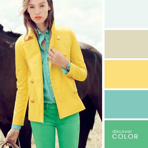 Это очень ярко! Будьте максимально осторожны с этим сочетанием. Много зелени в пустыне не бывает, это противоестественно. Его нужно разбавлять белым, если хотим получить летний легкий и радующий глаз наряд. При этом не имеет значения, какой именно цвет Вы используете из гаммы желтого или зеленого. Указанное правило, в отношении разбавления цветов, касается всех оттенков.