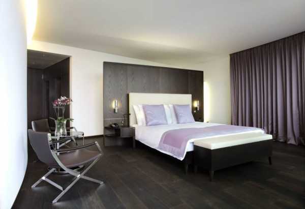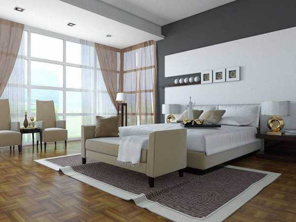 Полы в спальне оформляются паркетной доской или широким ламинатом холодных оттенков. Пол не должен быть нереально ярким, лучше придерживаться сдержанных тонов без вычурной текстуры, так как поверхность не должна привлекать особое внимание. Такой дизайн полового покрытия показан на фото: