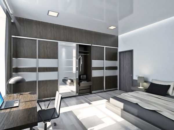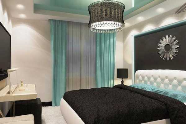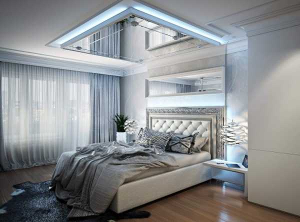 - Акриловые натяжные потолки с глянцевым эффектом визуально увеличат пространство спальни.