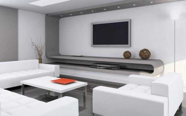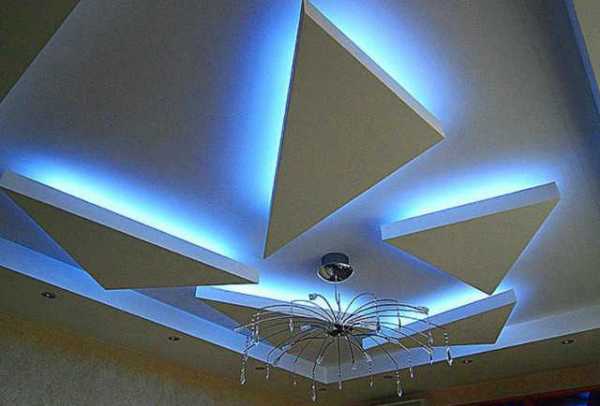 - Многоуровневый потолок. Сделать хай-тек можно посредством декорирования потолка. Несколько уровней прохладных оттенков, светодиодная лента и точечные светильники создадут атмосферу хай-тек в любом помещении.