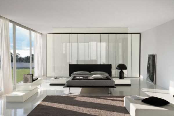 Дизайн спальни в стиле хай-тек прежде всего требует свободного пространства, без массивных шкафов и комодов
