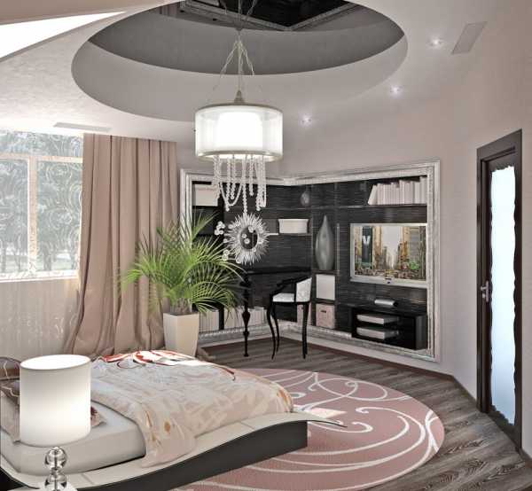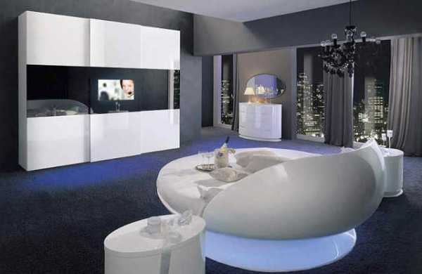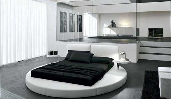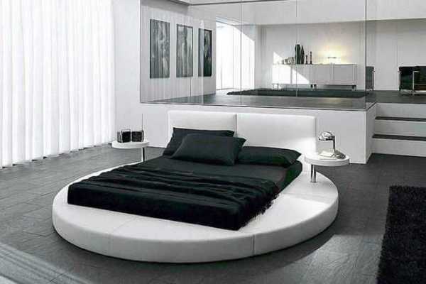 - Круглая кровать. Футуристично и живо выглядит круглая кровать на небольшом подиуме. Это вариант для настоящих ценителей стиля.