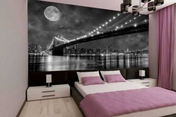 Для зрительного увеличения спальни можно применить фотообои. Вряд ли это будет природа или животные. Урбанистический стиль приемлет городские пейзажи. Мосты, стальные и стеклянные небоскребы, серые улицы, панорамные изображения современных городов подойдут лучшим образом. С таким декором спальня в стиле хай-тек будет более динамичной и интересной.