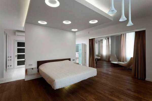 Спальня в стиле хай-тек может иметь подвесной потолок с металлическими или хромированными элементами, или глянцевый натяжной потолок. Стены должны быть однотонными, недопустимо использование обоев. Напольное покрытие следует выбирать из натуральных материалов, чтобы придать интерьеру уютную обстановку.