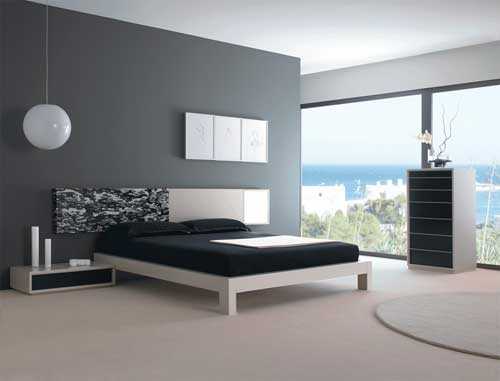 - Главным цветом в стиле хай-тек считается черный. Также идеально смотрится дизайн в сером или песочно-бежевых оттенках. Но, не стоит думать, что это скучный интерьер в сдержанных тонах. В качестве акцентов можно использовать синий, красный, зеленый и желтый, но не нужно собирать эти цвета все вместе, чтобы не сделать безвкусную радужную комнату. Спальни такого цветового решения можно увидеть на фото: