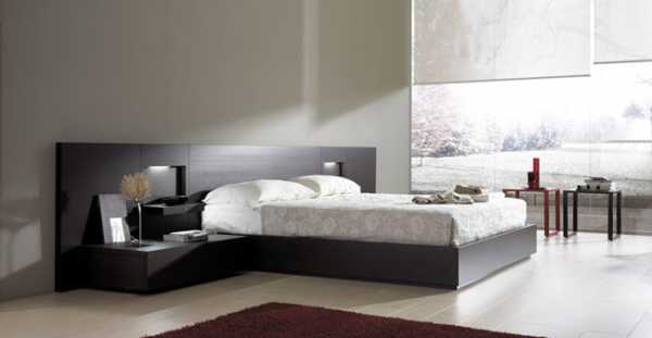 - Модульная мебель с кроватью. Очень функционально и геометрично будет выглядеть мебельный блок, объединяющий кровать с прикроватными тумбами или даже с целой системой хранения, расположенной над изголовьем кровати.