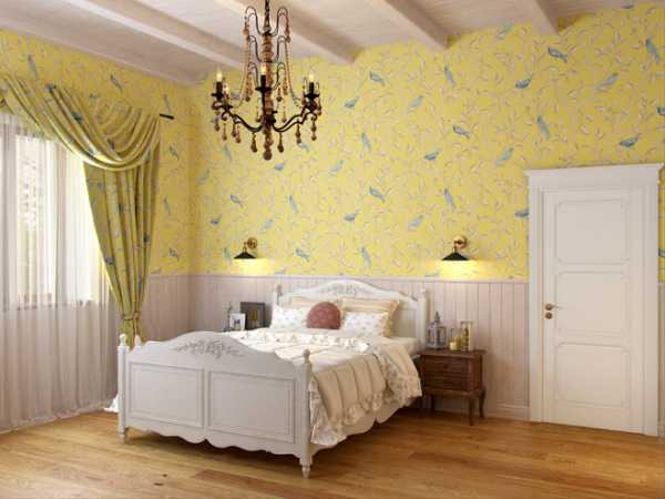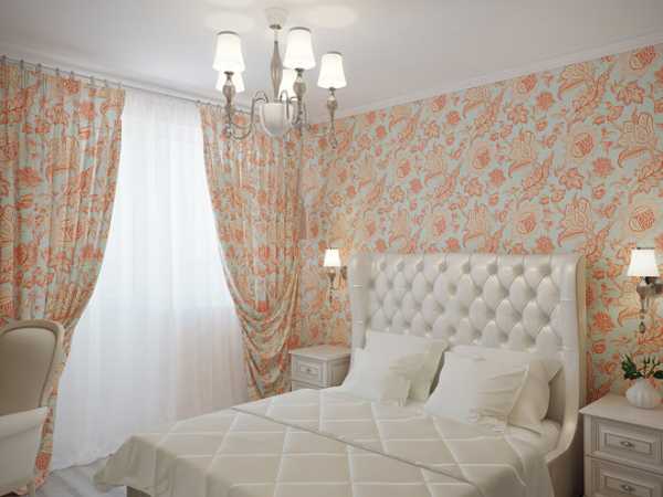Кровать в маленькую спальню, фотоСветлые обои в теплых тонах с мелким рисунком в гармоничном единстве со светлыми шторами способны обеспечить помещению невероятную привлекательность и уют.