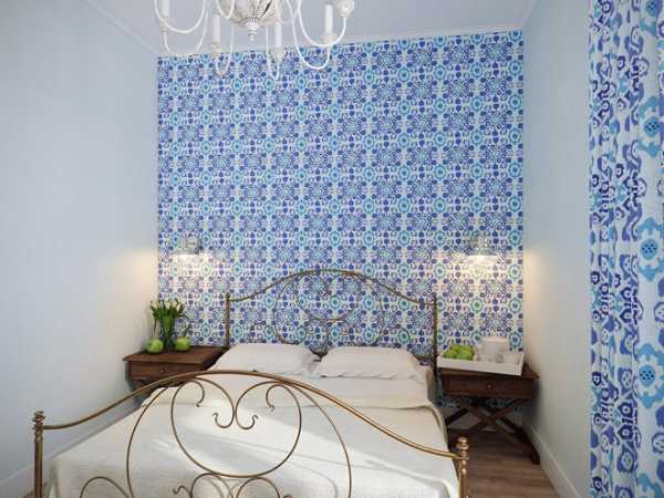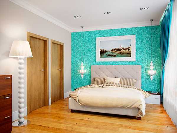 Дизайн узкой спальни может включать в себя контрастную отделку одной из дальних стен. Этот прием «подвинет» ее ближе, тем самым визуально приблизив форму комнаты к квадрату. Можно использовать не только яркий цвет, но и красочный принт. Он также придаст интерьеру динамику.