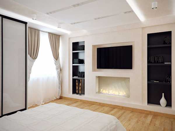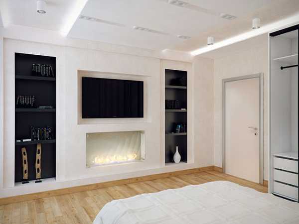 В маленькой спальне можно соорудить конструкцию из гипсокартона, в которой помещается телевизор, музыкальный центр, книги. Такое обустройство характеризуется своей компактностью и функциональностью, оно стильно смотрится в общем интерьере.