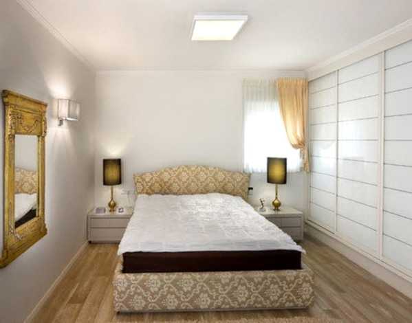 Интерьер небольшой спальни должен включать только самые необходимые предметы мебели. Больше всего места, как правило, занимает кровать. Для нее при ремонте стоит определить место в первую очередь. Шкаф по возможности лучше сделать встроенным с раздвижными дверцами или угловым. В любом случае, он должен быть максимально вместительным, а зеркальные дверцы помогут визуально увеличить пространство комнаты.