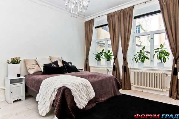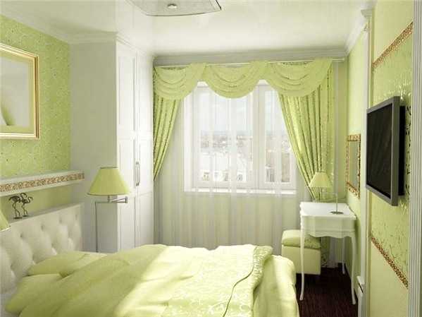 При выборе штор отдайте предпочтение легким занавесям. В небольшой спальне крупный рисунок штор, особенно цветочный, не приветствуется, он сразу усилит ощущение тесноты.