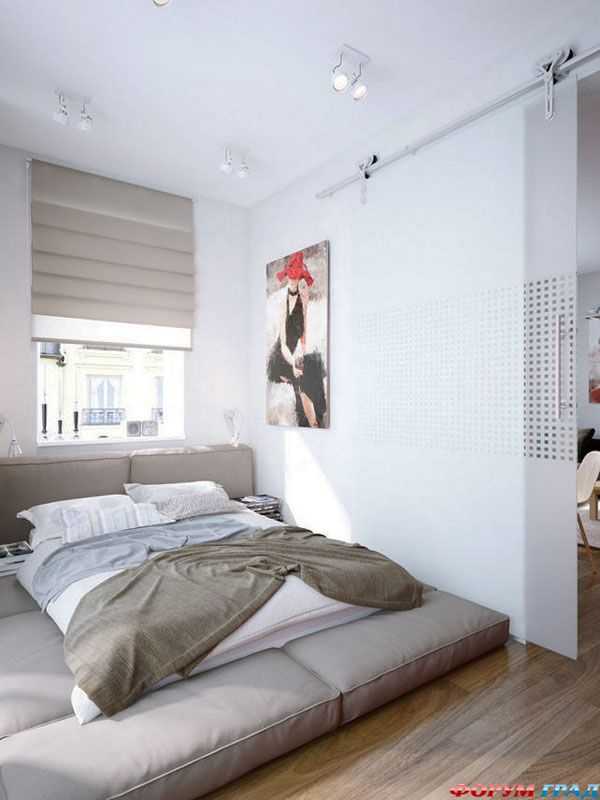 Ремонт в маленькой спальне: фото вариантовУстанавливайте низкую мебель в азиатском или любом восточном стиле, которая визуально занимают меньше места и создает ощущение ширины и пространства. Допускается использование небольшого подиума для низких двуспальных кроватей.