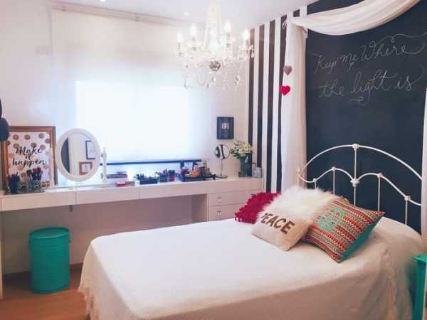 Сегодня популярно смешивать несколько стилей в интерьере, это касается даже оформления небольших спален. Не обязательно дизайн такой комнаты должен быть скучным, его можно разнообразить! В этой комнате смело пошли навстречу экспериментам: одну из стен покрыли грифельной краской, у окна сделали комфортную рабочую зону с туалетным столиком, а посреди комнаты установили красивую хрустальную люстру, которая не утяжеляет пространство, а наоборот облегчает его.