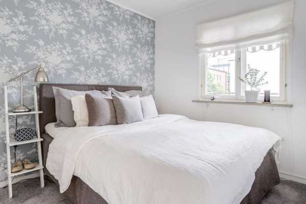 Есть один секрет для тех, кто хочет зрительно увеличить маленькую спальню. Необходимо выбрать одну из стен, декорировать её интересными обоями или покрасить в интересный цвет, а остальные стены оставить в нейтральном оттенке. Так сделали в этой небольшой спальне и получилось очень стильно!