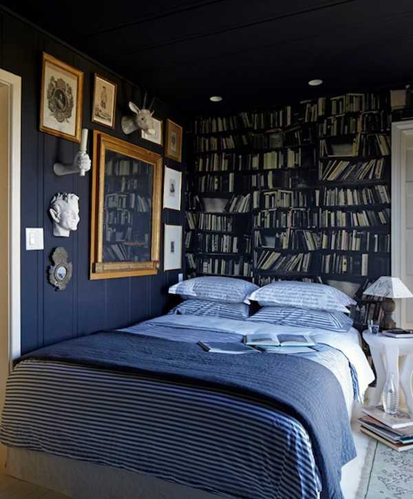Желательно в маленькой спальне устанавливать такие стеллажи до потолка, она в таком случае зрительно будет выглядеть выше. Окрасив стену возле стеллажа контрастным цветом, вы подчеркнете его глубину и стильное оформление.