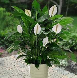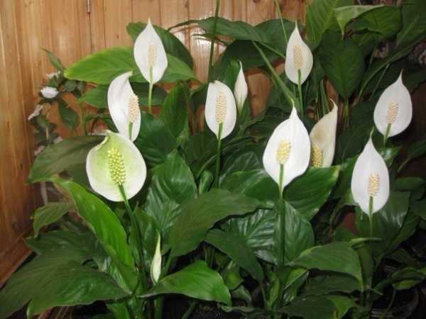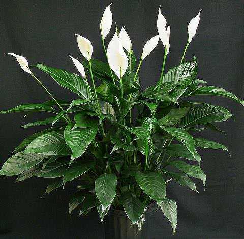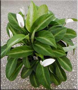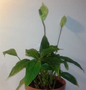 - Спатифиллум Уоллиса (англ. Spathiphyllum Wallisii) достигает в высоту 20-30 см. Темно-зелёные листья этого растения очень красивые и изящные. Цветет оно очень обильно. Сами цветки сначала белые, а затем зеленеют и становятся похожими на листки. Именно это растение отлично подходит для выращивания в домашних условиях, так как оно не прихотливое нормально переносит тень.