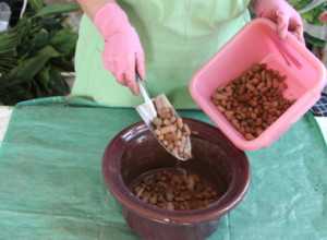 - Контейнер должен быть больше прежнего на 2-3 см по диаметру. Следует учесть, что растение нуждается в пересадке ежегодно, и каждый раз ёмкость увеличивается. Дренажное отверстие прикрывается выпуклым черепком, сверху насыпается керамзитовые шарики иль галька.