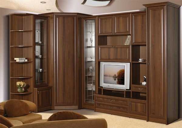 Угловые стенки максимально эффективно используют пространство. Они занимают место, которое обычно пустует – угол комнаты. Здесь размещается шкаф особой конструкции, а по обе стороны от него – дополнительные секции. Такая мебель хорошо смотрится даже в самых маленьких гостиных.