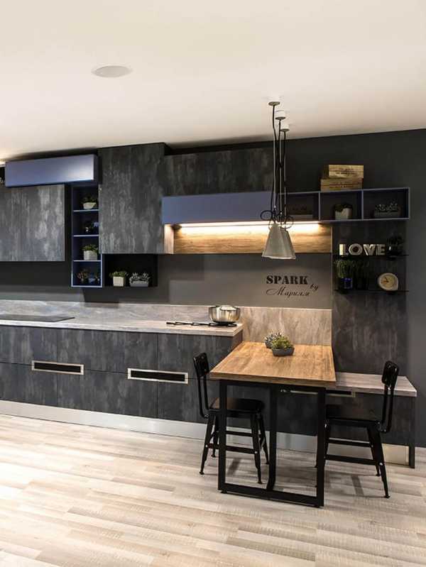 На смену окрашенным и пленочным поверхностям приходят покрытия, имитирующие натуральные материалы: камень, кирпич, бетон и дерево. По-прежнему актуальна подсветка подвесных полок, шкафчиков и кухонного фартука.