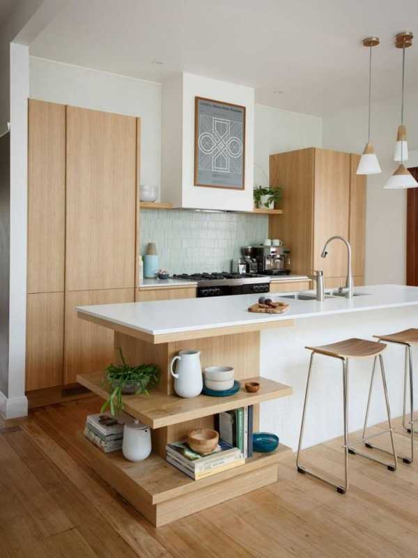 Что еще происходит с кухней в 2018 году? Она все больше становится похожа на жилую комнату и все меньше на кухню. Этому способствуют популярные открытые планировки, объединяющие зону кухни и гостиной. Элементы дизайна гостиной перетекают в интерьер кухни. Подвесные кухонные шкафчики частично съезжают, освобождая место для открытых полок с подсветкой, где может разместиться тот самый не кухонный декор.