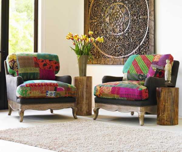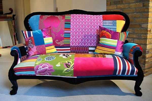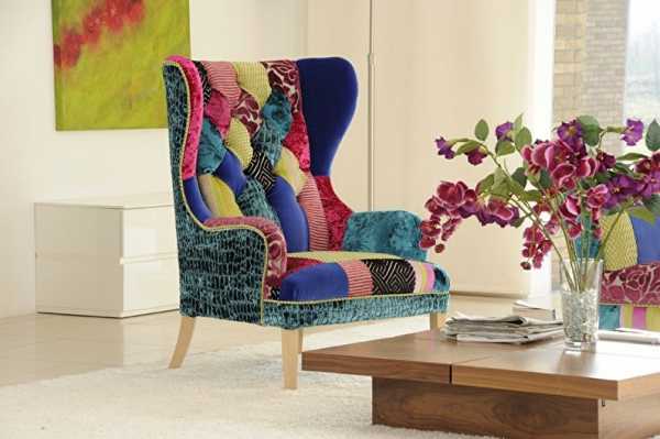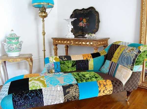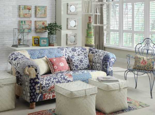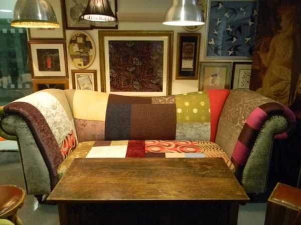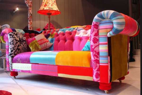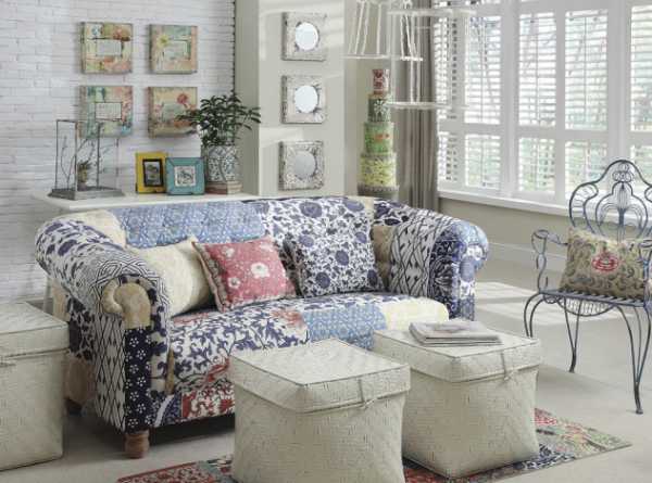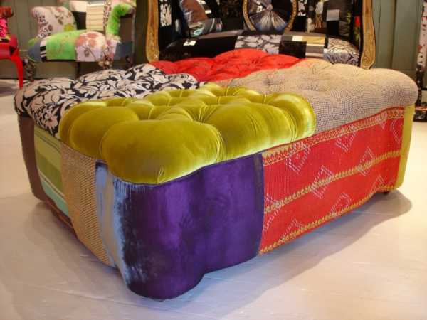 Не стоит ограничиваться только коврами, подушками и одеялами. Мебель пэчворк выглядит эффектно и притягательно. Это не только диваны, пуфы и кресла, но и комоды, тумбы, столешницы с характерным для стиля принтом.
