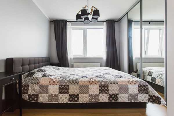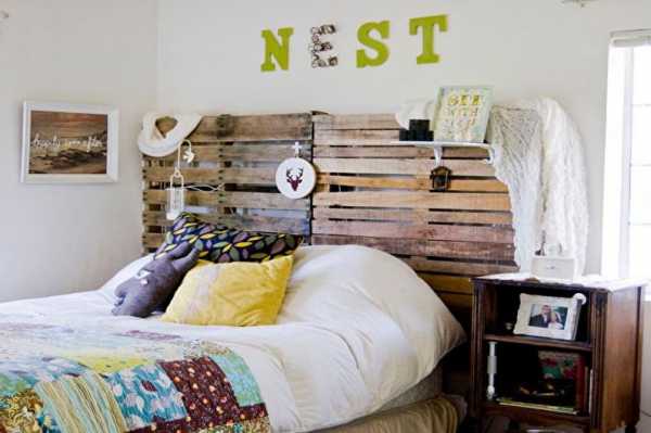Спальню украсит оригинальное панно в изголовье. В качестве перегородки используется лоскутная штора.