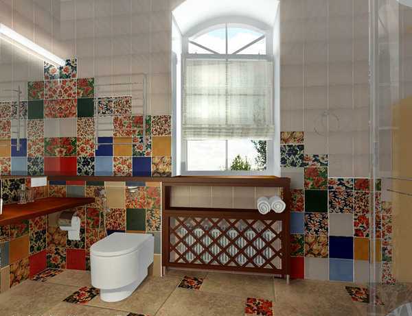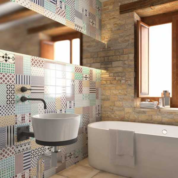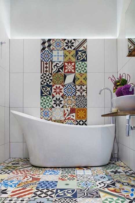 Как и на кухне, пол и стены служат великолепным полем для реализации стиля с помощью керамической плитки. Стиль пэчворк в интерьере ванной можно выразить, оформив нижнюю часть одной из стен по диагонали разноцветной плиткой. Верхний край делают в виде ступенек. Более стандартный вариант – пол и одна из стен из комбинированной, разноцветной плитки. Зона возле раковины также может олицетворять стиль.