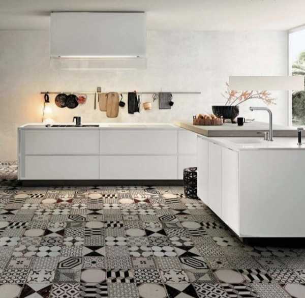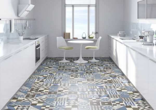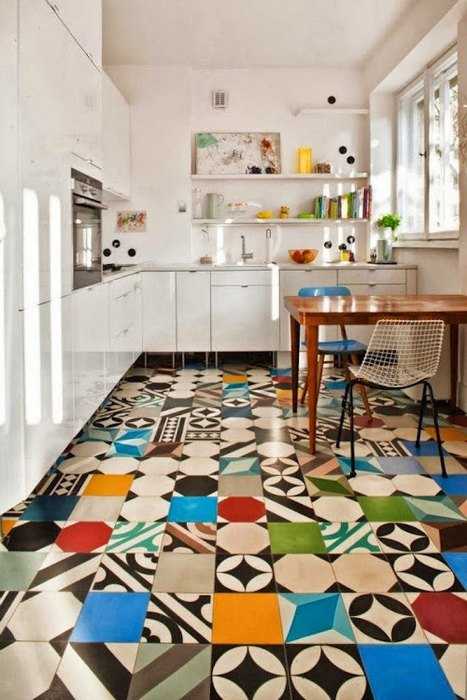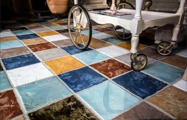 Декорируется пол с помощью напольной плитки в стиле пэчворк. В некоторых случаях применяются кусочки линолеума.