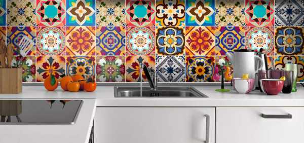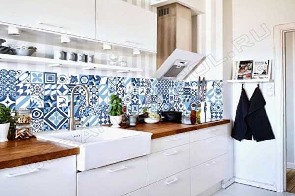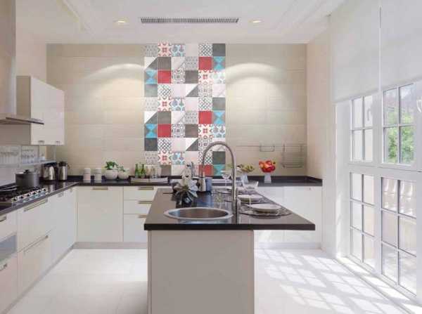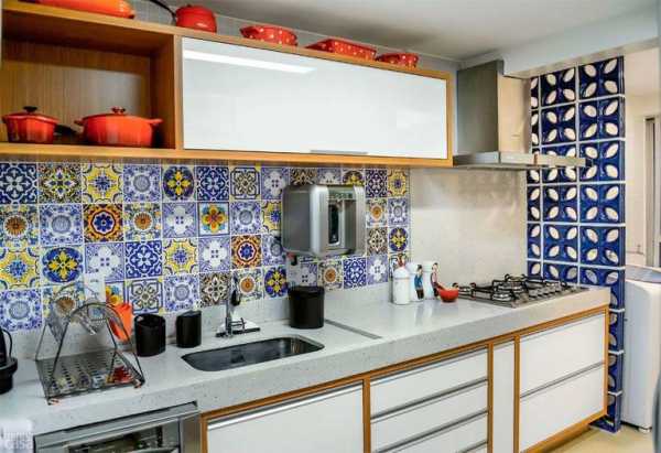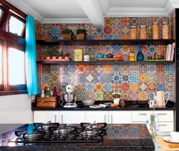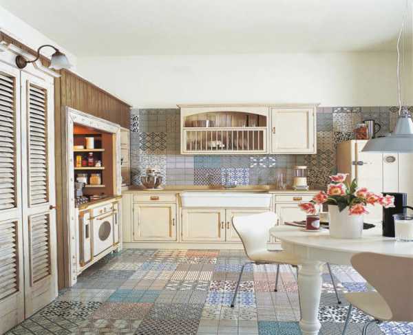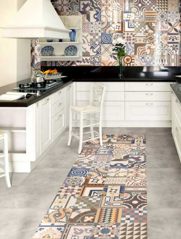 Реализовать пэчворк в интерьере кухни поможет керамическая плитка. Ее цветные комбинации могут украшать пол (полностью или частично), а также одну или несколько стен. Нередко укладывают цветные композиции в зоне между столешницами и подвесными кухонными шкафчиками.