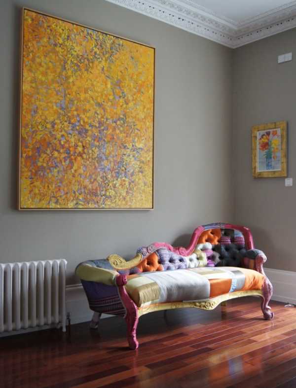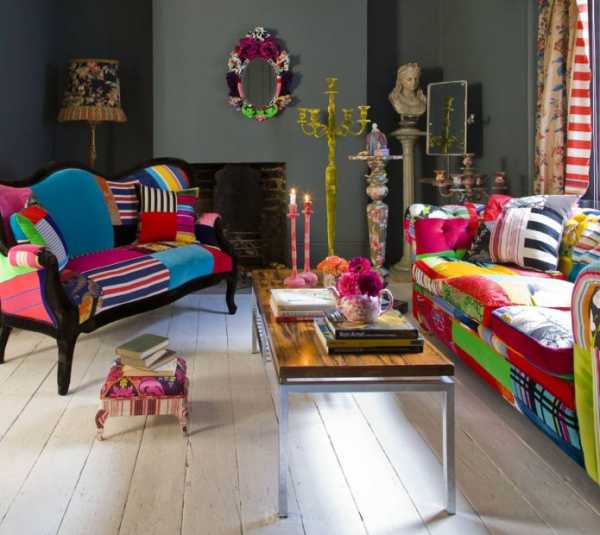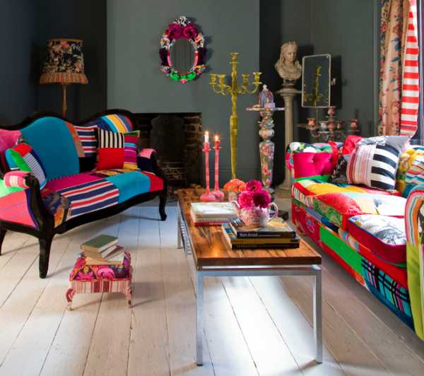 Новый рост популярности на пэчворк в интерьере был в 70-х годах. Тогда не только во многих интерьерах молодежи преобладали яркие цвета и их сочетания, но и в одежде.