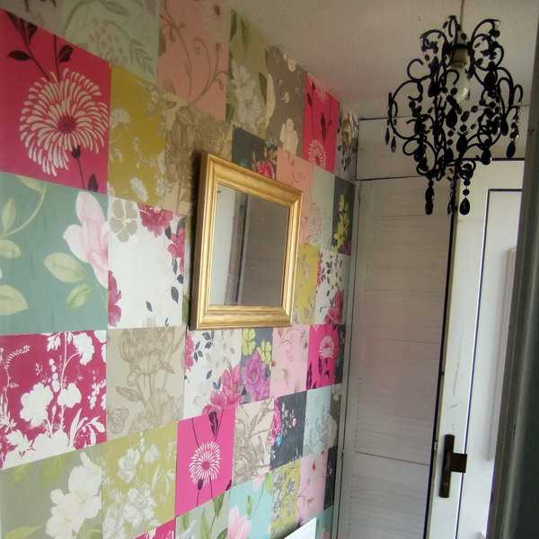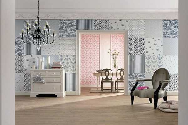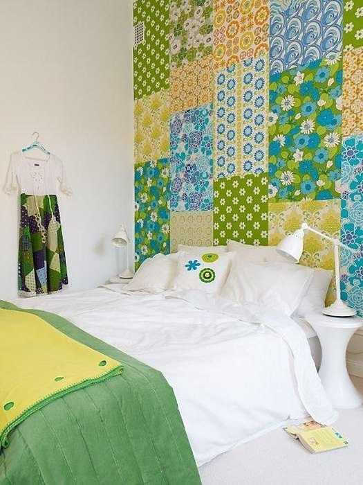 Для стен применяются сшитые лоскуты. Также используются специальные обои пэчворк. Если нет подходящих готовых вариантов, то стоит изготовить самодельные обои. Для этого старые неиспользованные обои нарезаются на одинаковые квадраты и наклеиваются на поверхность. Таким образом, оформляется одна стена или отдельная ниша.