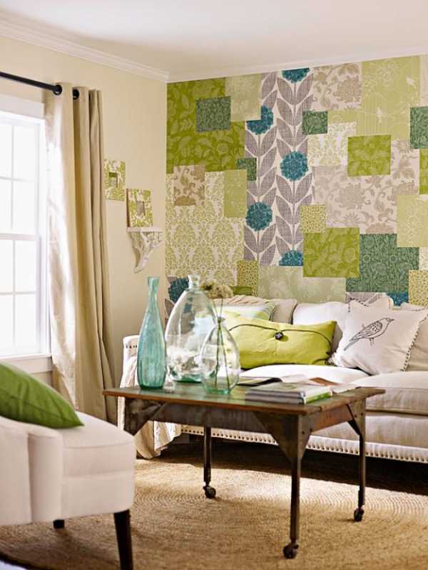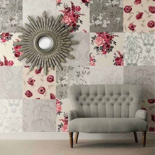 Это один из самых доступных и стильных видов декора. Для пэчворка из обоев можно использовать обрезки, оставшиеся после ремонта или же купить несколько лоскутков из модных коллекций. Это не будет затратно, зато интерьер преобразится на глазах. Этот приём будет отлично смотреться на одной из стен. Особенно эффектно использовать пэчворк из обоев в спальне или детской комнате.