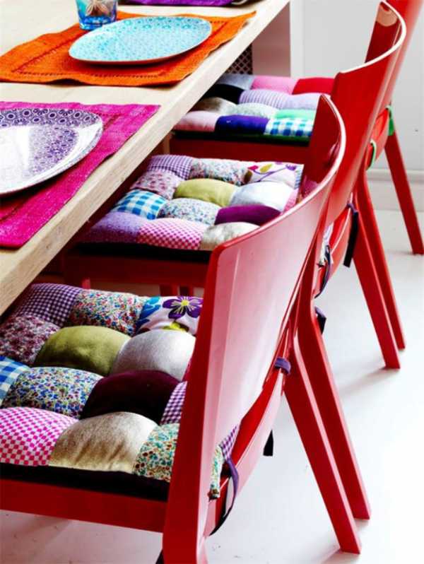 - Любую комнату украсят стулья в технике пэчворк. Для их создания можно просто поменять обивку или сшить подушечки с завязками.