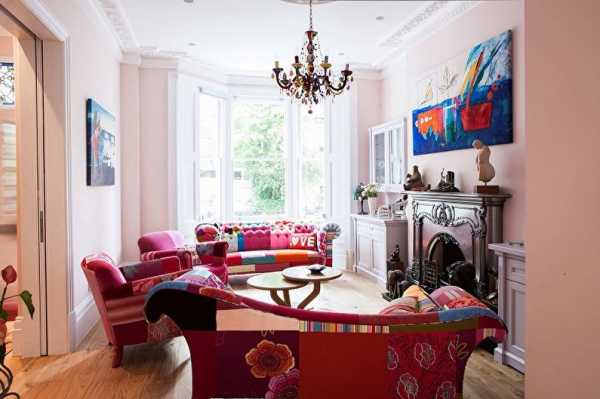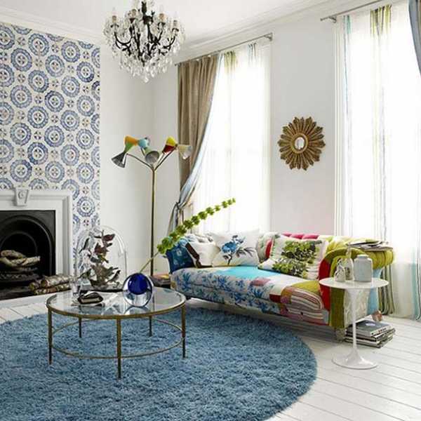 Так как гостиная визитная карточка дома, а стиль подразумевает калейдоскоп красок, важно не забывать про умеренность. Даже один диван из ярких лоскутков будет центром внимания. Не рекомендуется при оформлении гостиной использовать много декора, так как комната будет слишком цветастой, перегружая зрение.