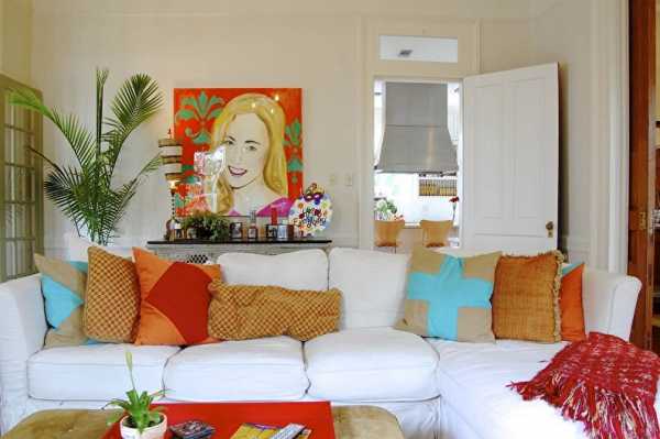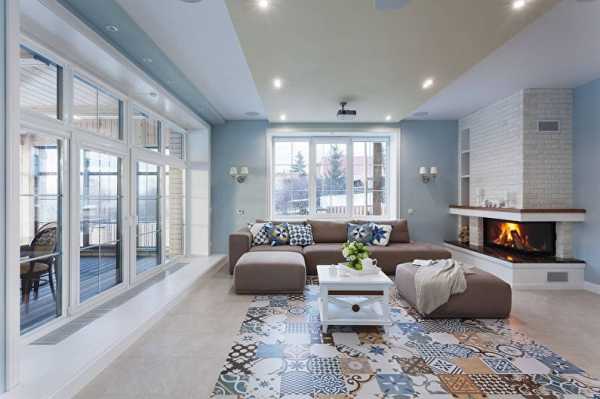 Если хочется, чтобы в комнате было больше стиля, поставьте два дивана, например, друг напротив друга. Дополните их цветными подушками. Диванную зону можно обустроить недалеко от камина, стена за которым выложена керамической плиткой пэчворк. Остальные стены – белого цвета.