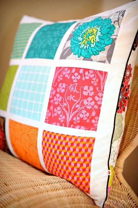 Мебель украсьте лоскутными чехлами, смастерите покрывала либо рискните и сделайте саму обивку. Однако последний вариант довольно сложен в исполнении, для начала лучше попрактиковаться в более простых вещах. Как вариант, сшейте наволочки для подушек и расположите их на однотонном диване или кровати. Это могут быть узоры в виде крупного ромба, креста в гостиную либо же комбинация из двух видов ткани в горох и цветочек в детскую для юной принцессы.