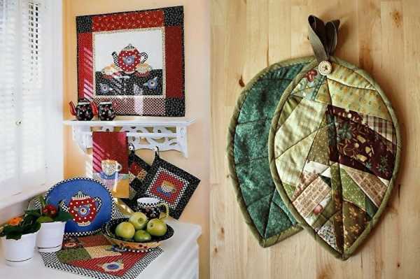 Прихватки, дорожки под тарелки, полотенца, накидки на стульчики и даже скатерть можно выполнять в разнообразных техниках лоскутного шитья. На стене прекрасно будет смотреться тематическое панно, изображающее сервиз на кружевных полках. Сделайте сразу несколько таких предметов, сочетающихся между собой – на кухне в стиле кантри перестараться с декором не так уж и просто.