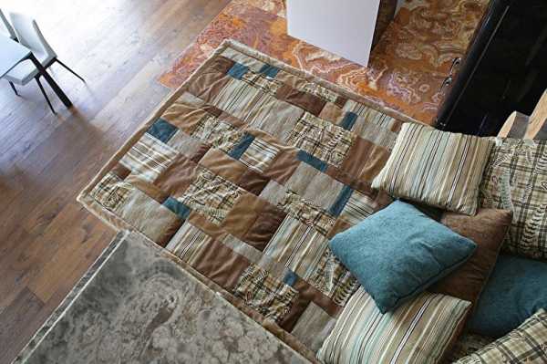 - Лоскутные покрывала и подушки для кроватей подойдут для детских комнат. Для гостиной рекомендуются декоративные подушки.