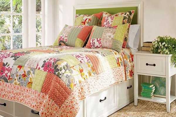- Торшер или прикроватные светильники, гармонирующие с покрывалом из лоскутков.
