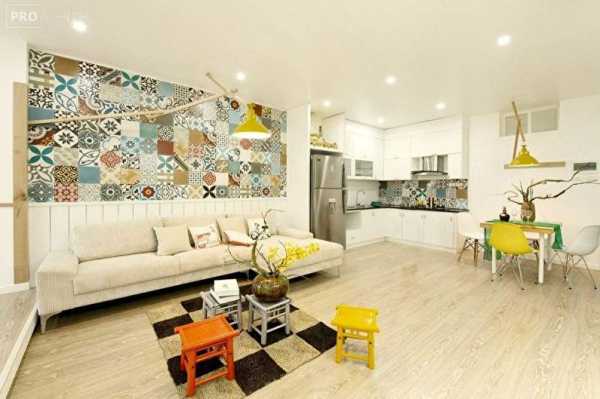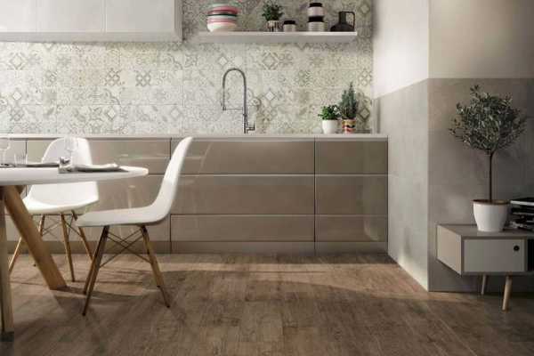 Можно использовать сочетания нейтрального по цвету ламината и плитки в стиле пэчворк. Таким способом также зонируется помещение.