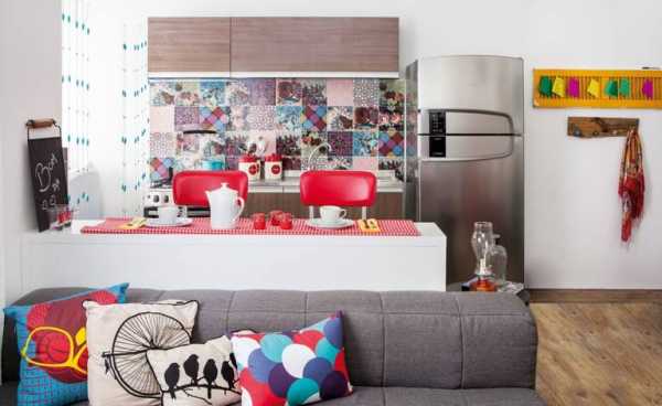 Подходит пэчворк для кухни. Лоскутный декор гармонирует с плетеными изделиями, древесиной или камнем. Стильно смотрится стена, выложенная в лоскутной технике. Занавески украшают бусинами или цветными пуговицами. Дополнением к интерьеру служат прихватки, салфетки и чехлы.