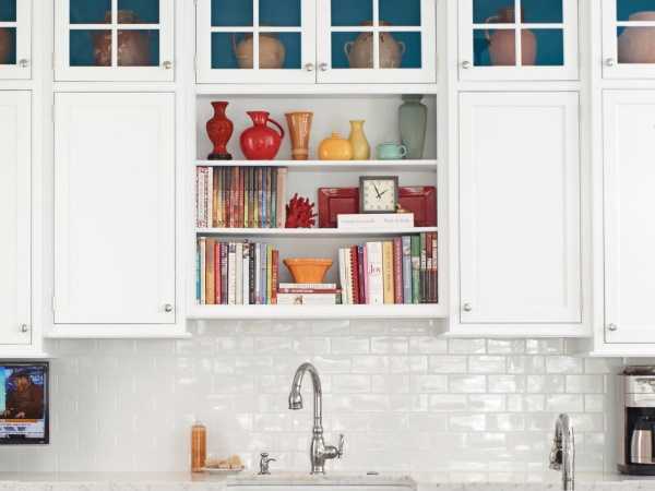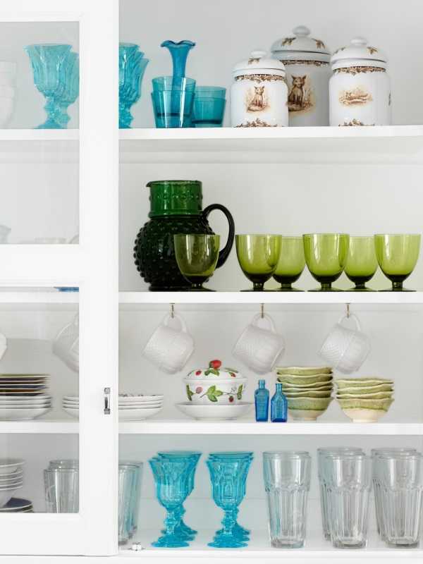 Открытые полки или прозрачные дверцы шкафчиков позволяют представить ваши любимые тарелки, чашки, вазы и другую посуду в самом выгодном свете. Предметы могут перекликаться по цвету с другим кухонным декором (кухонные полотенца, шторы) или же расставляются в определенном порядке, например, согласно радуге и т. д.