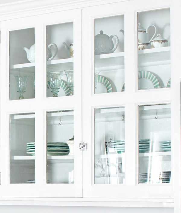 Многие хозяйки находят для себя неудобным иметь открытые полки на кухне, поскольку за ними нужен больший уход. В таком случае для них лучшим выбором будут закрытые шкафчики, но с прозрачными дверцами.