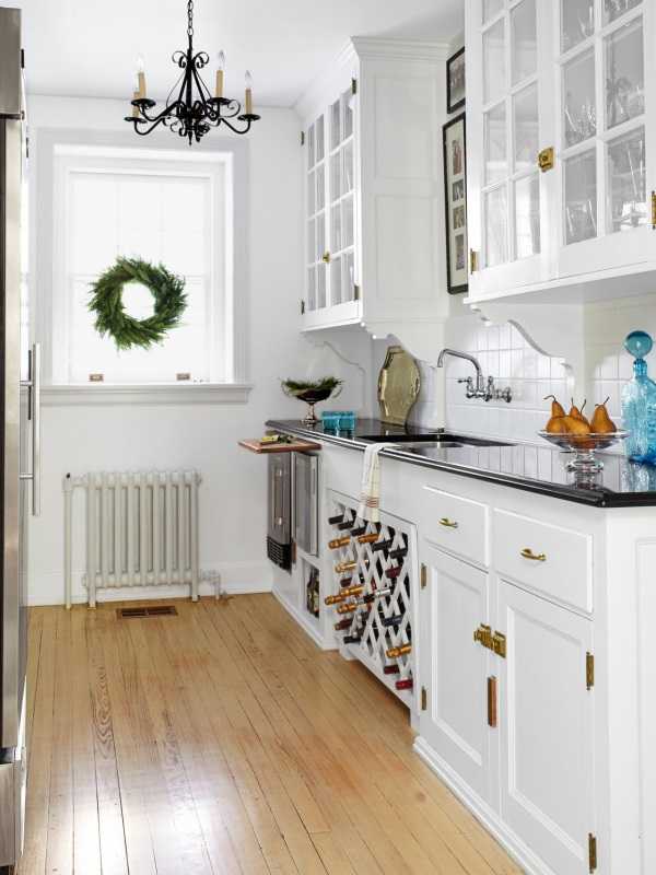 Встроенные в шкаф или стену полки для вина придают кухне неожиданную элегантность и пригородный шарм.